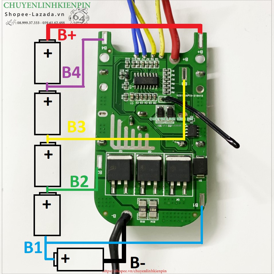 - Hàn theo thứ tự từ B- (0V), B1(3.6V/4.2V), B2(7.2V/8.4V), B3(10.8V/12.6V), B4 (14.4V/16.8V) và B+/B5 (18V/21V).