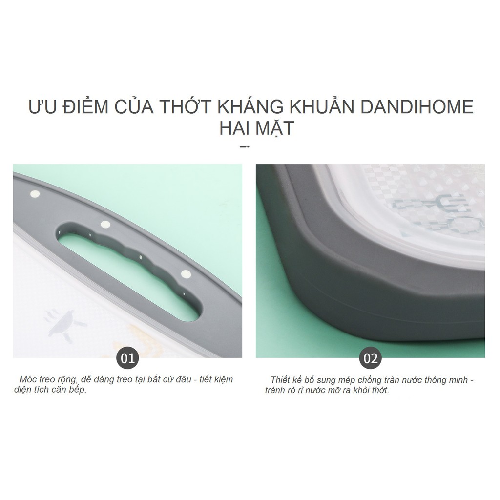 - Đặc biệt thớt 2 mặt DandiHome có bề mặt dễ dàng vệ sinh, lau chùi. Cùng với móc treo được thiết kế vô cùng tiện dụng, giữ cho không gian bếp gọn gàng và ngăn nắp.