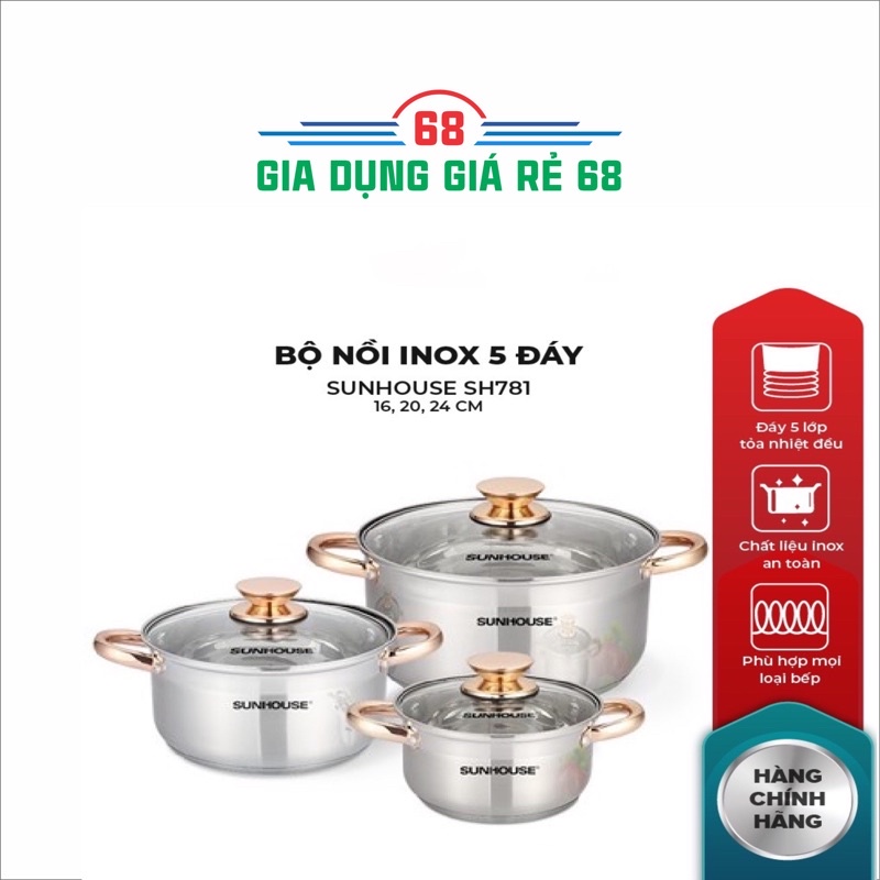 Bộ nồi inox 5 đáy SUNHOUSE SH781 sử dụng được với mọi loại bếp, kể cả bếp từ. Bộ sản phẩm gồm 3 nồi với đường kính 16cm - 20cm - 24cm phù hợp với nhu cầu nấu nướng của mọi gia đình. Nồi nhỏ 16cm thích hợp để luộc trứng, kho thịt, nồi cỡ trung 20cm để nấu canh cho 2-4 người và nồi lớn 24cm có thể luộc gà, nấu canh hoặc lẩu cho 3-5 người.