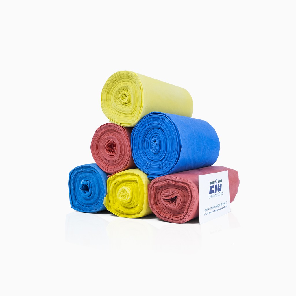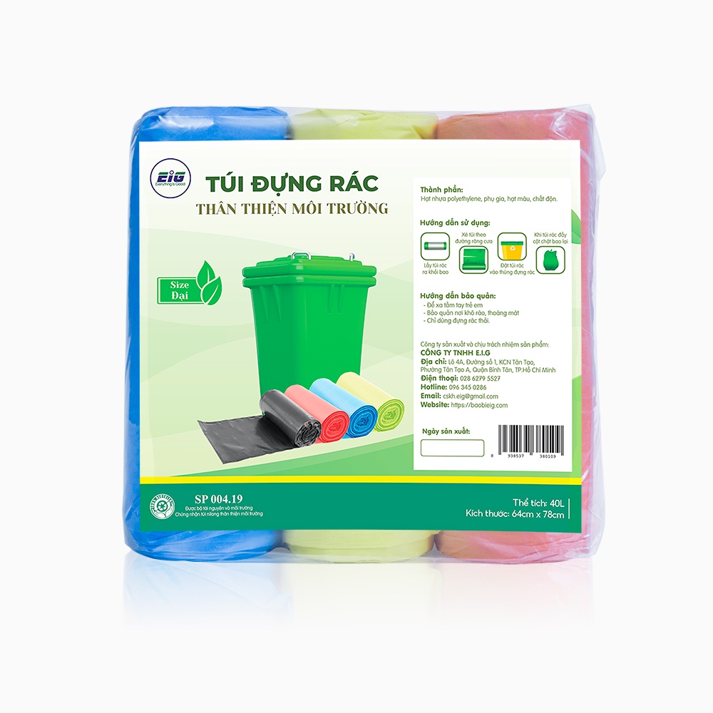 Túi đựng rác phân hủy sinh học E.I.G được làm vật liệu có nguồn gốc thực vật tái tạo và polyme sinh học. Giúp túi có bộ dẻo và độ bền cao. Có khả năng chứa được các rác thải nhọn, nặng mà không bị thủng, rách. Dễ dàng phân hủy từ 3 đến 6 tháng trong môi trường sinh học. Túi rác có 3 màu sắc giúp dễ dàng phân loại rác và tái chế rác thải.Túi rác có 4 size gồm: