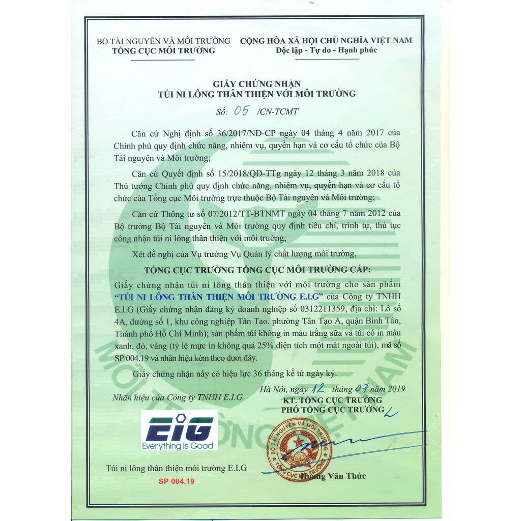 Công Ty TNHH E.I.G tự hào là nhà sản xuất được bộ tài nguyên và môi trường chứng nhận là túi ni lông thân thiện với môi trường. Giúp cuộc sống thêm xanh.