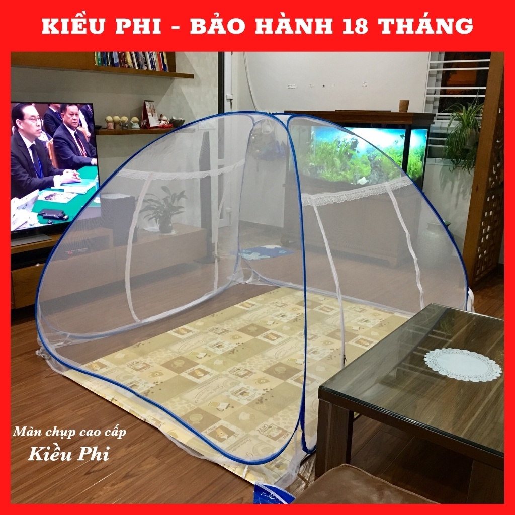 - Kiều Phi đầy đủ 4 kích thước 1m2x2m, 1m6x2m, 1m8x2m, 2m2x2m. Màn chụp đỉnh vuông, đỉnh rộng cao 1,7m và có 1 vòng tròn kèm theo để dắt lên trên đỉnh màn chụp căng đẹp. Màn chụp đỉnh chóp cao 1m55 đỉnh nhọn vào giữa.