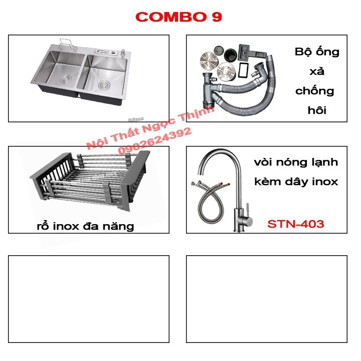 combo 9: 4 sản phẩm gồm chậu rửa chén + bộ ống xả thoát nước chống hôi + rổ đa năng inox + vòi rửa chén Nóng lạnh xoay 360 độ STN-403 (kèm dây cấp)