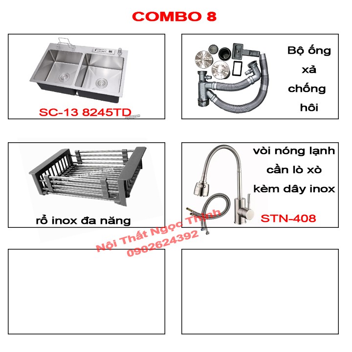 combo 8: 4 sản phẩm gồm chậu rửa chén + bộ ống xả thoát nước chống hôi + rổ đa năng inox + vòi rửa chén Nóng lạnh cần uốn dẻo lò xo STN-408 (kèm dây cấp)