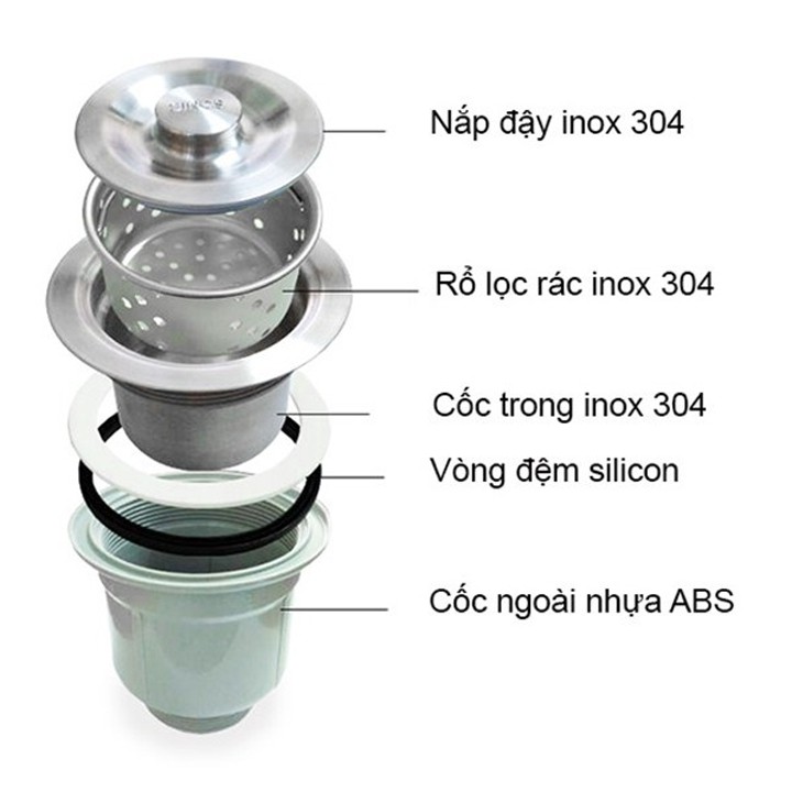 Combo 4: 5 sản phẩm gồm chậu rửa chén + bộ ống xả thoát nước chống hôi + rổ đa năng inox + vòi rửa chén lạnh inox 304 mẫu ống phi 18 (tặng kèm dây cấp inox) + bình đựng nước rửa chén inox nhấn hơi