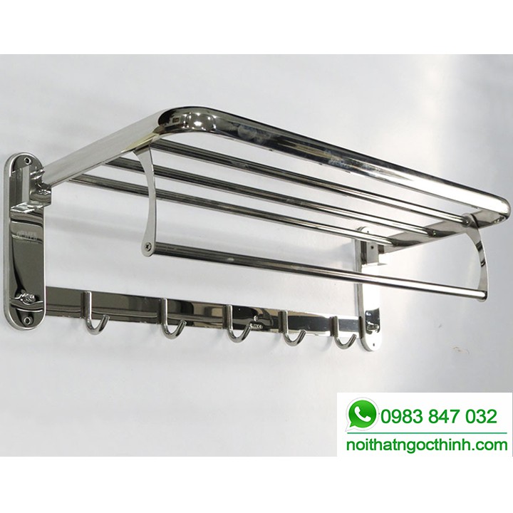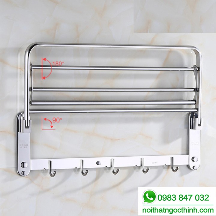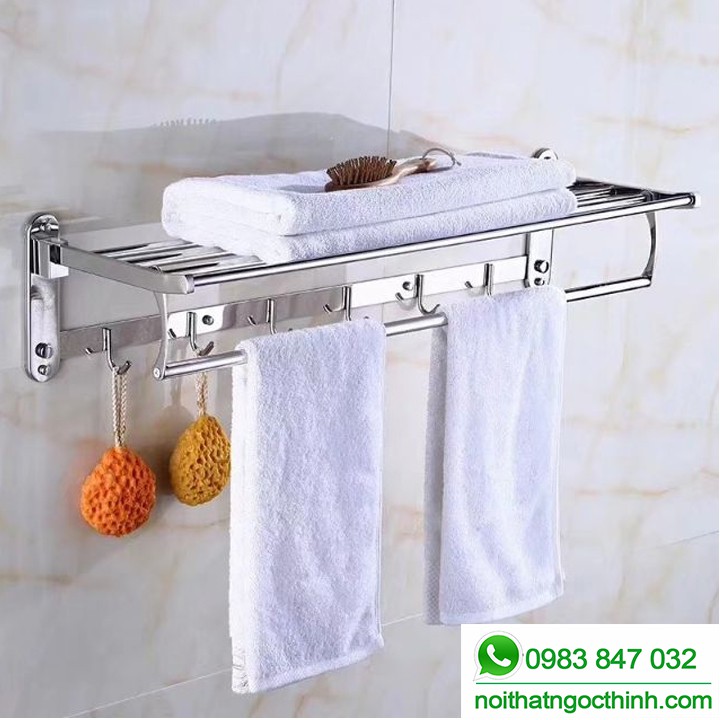Kệ treo khăn thiết kế đa năng, tầng trên để đặt khăn tắm khi xếp thành cuộn; có 1 thanh ngang để vắt khăn tắm cho khô; bên dưới thiết kế thanh móc treo đồ với 5 móc trụ đặc. 5 móc trụ đặc uốn cong lên để giữ quần áo móc vào dễ dàng mà không tuột rơi xuống, phần đỉnh móc được mài nhẵn trơn tru, nên không gây ra rách quần áo khi móc lên.
