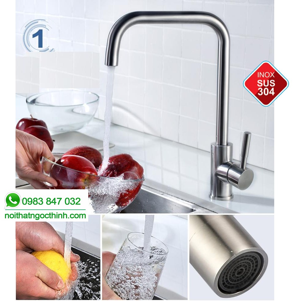 * Thiết kế & tính năng: Vòi thiết kế hiện đại với ống vòi thuôn hình trụ được đúc 100% từ inox 304. Ống vòi xoay linh hoạt 360 độ quanh trục đế của vòi, nên sử dụng được cho cả chậu rửa chén 1 ngăn cũng như chậu rửa chén đôi 2 ngăn, vô cùng tiện lợi cho chị em trong việc nội trợ. Phần đầu xả nước của vòi được thiết kế 1 màng lọc lưới để lọc những cặn bẳn trong nước. Nên khách hàng lưu ý khi sử dụng, là trung bình 3 tuần nên tháo ren đầu vòi ra và vệ sinh sạch phần lưới lọc, tránh tình trạng chất bẩn bám nhiều vào lưới lọc làm giảm độ mạnh của nguồn nước và gây mất vệ sinh cho nguồn nước.