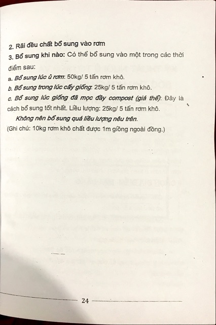 1. Bổ sung bằng cách trộn vào nguyên liêu RƠM ĐÃ Ủ SẴN. Lưu ý: RƠM ĐÃ Ủ SẴN phải đạt yêu cầu, không bị chua, nhiễm tạp. Nếu rơm ủ không đạt thì KHÔNG NÊN bổ sung vì có thể làm gia tăng bệnh hại.