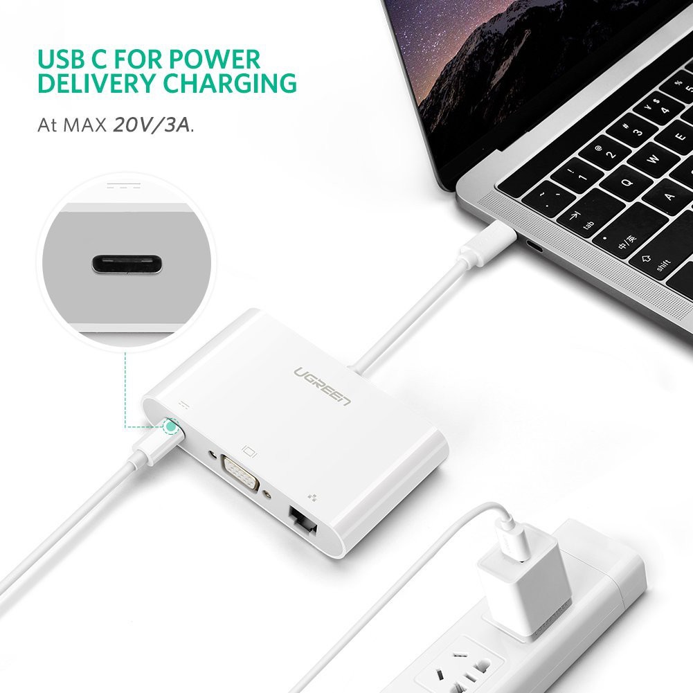 - Cáp chuyển đổi USB-C to VGA / Ethernet / Hub USB 2.0 Ugreen UG-30439 được thiết kế để kết nối MacBook với cổng USB-C để một hiện HDTV