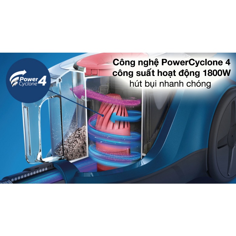 Sử dụng công nghệ PowerCyclone 4 với động cơ công suất 1800W tạo công suất hút 360W hút sạch mọi ngóc ngách