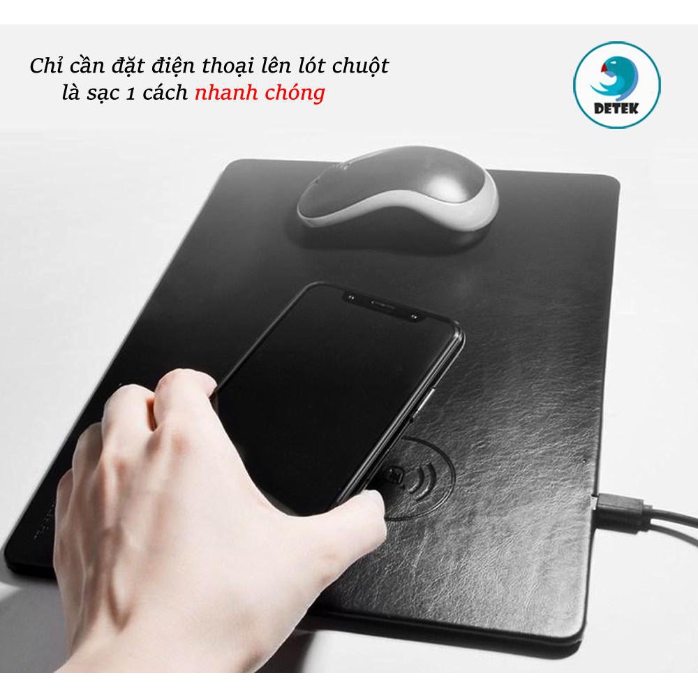 Bộ sạc không dây tích hợp bàn lót chuột Detek công nghệ mới QIHỗ trợ chức năng sạc không dây QI làm cho máy tính Hoạt động hiệu quả và thuận tiện hơn. Bề mặt da chất lượng cao và thiết kế không thấm nước. Bằng cao su bóng , độ bền cao, không bị biến dạng.