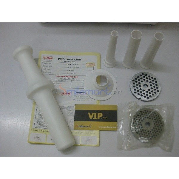 - Phụ tùng kèm theo: Dao xay bằng Inox, ống và trục nghiền bằng hợp kim nhôm, có nhiều lưới xay để lựa chọn ( xay nhiễn, vừa và lớn) và ống tạo khuôn làm lạp xưởng...