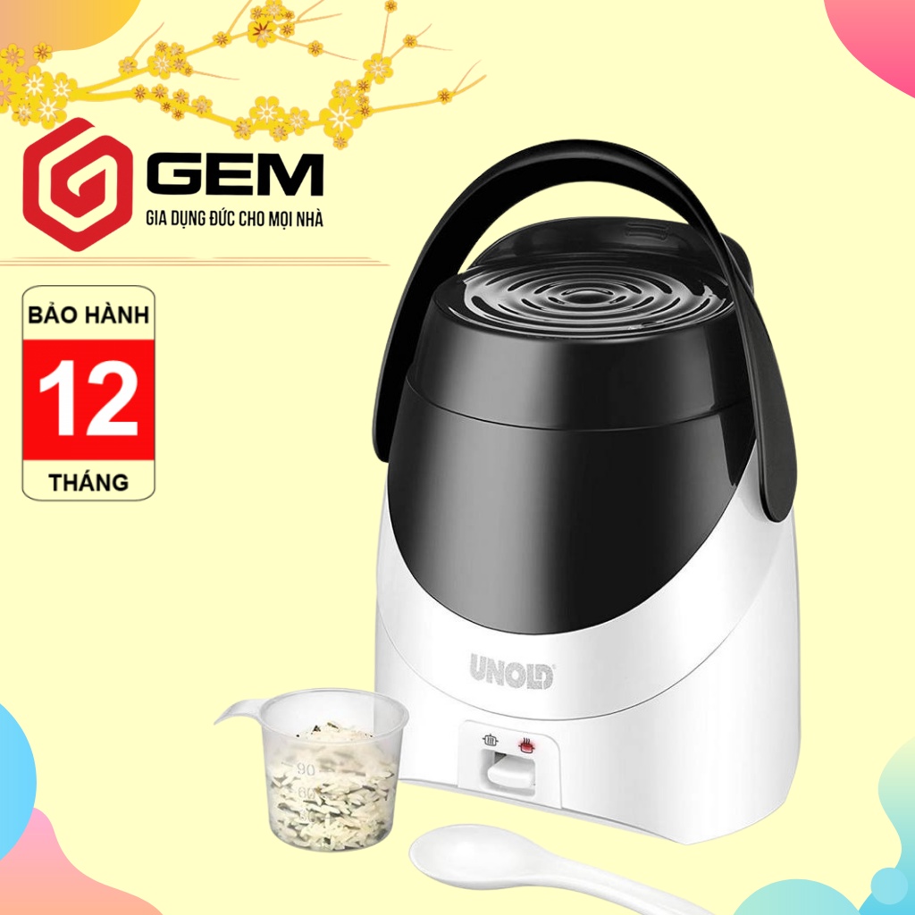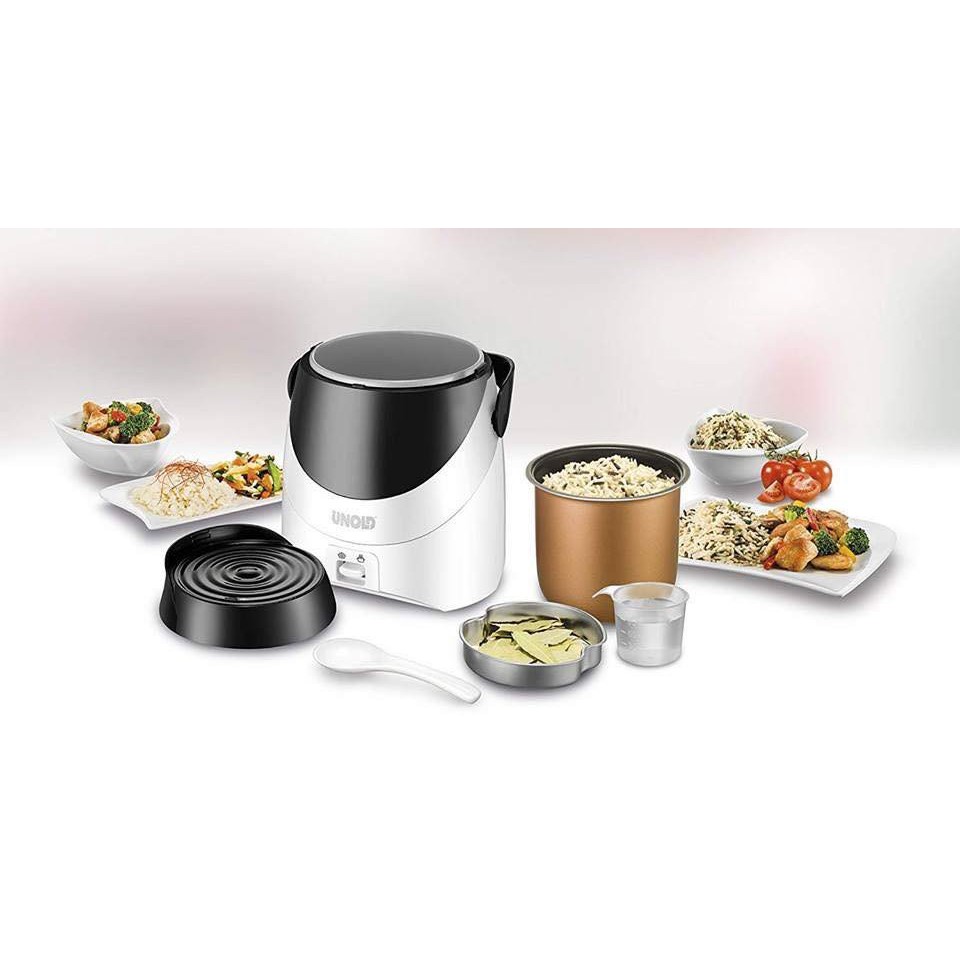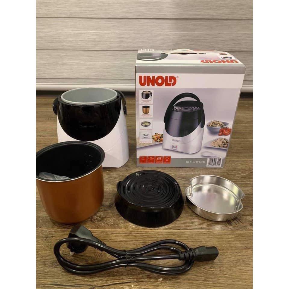 - Đi kèm với nồi cơm điện mini Unold là cốc đong gạo cùng vòng sưởi phân phối nhiệt. Chức năng chủ yếu của vòng sưởi này là giúp điều hòa nhiệt trong nồi để cơm chín thấu, chín mềm và không bị cháy. Lòng nồi có lớp chống dính nên không sợ bị dính thực phẩm vào nồi, dễ vệ sinh. Nồi cơm điện có hệ thống điều khiển cơ, tiện điều chỉnh và sử dụng.