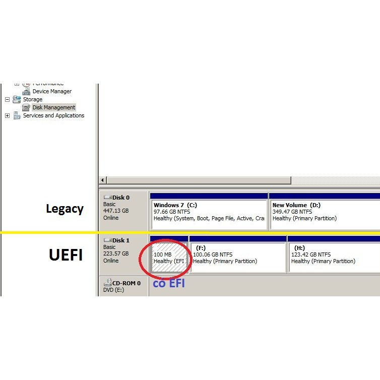 Các bạn vào xem ổ đang dùng chuẩn Lagacy hoặc UEFI thì kiểm tra như nhauNhấn phải chuột vào My Computer => Manage => Disk managent ổ sẽ hiển thị như ảnh