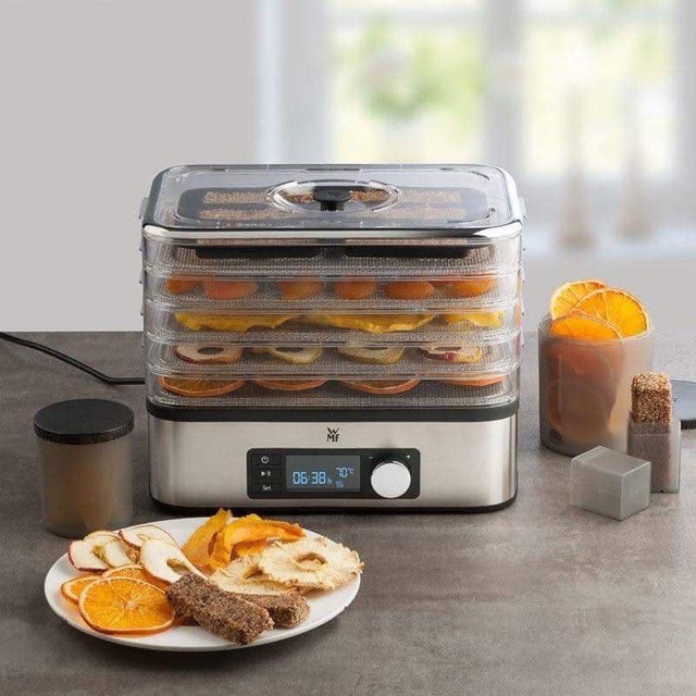 Màn hình điển tử LCD hiển thị nhiệt độ và thời gian sấy còn lại. Vỏ máy làm bằng chất liệu thép không gỉ cao cấp Cromargan 18/10 độc quyền WMF. Máy có 5 tầng sấy từ chất liệu Tritan, bền đẹp và an toàn cho thực phẩm.
