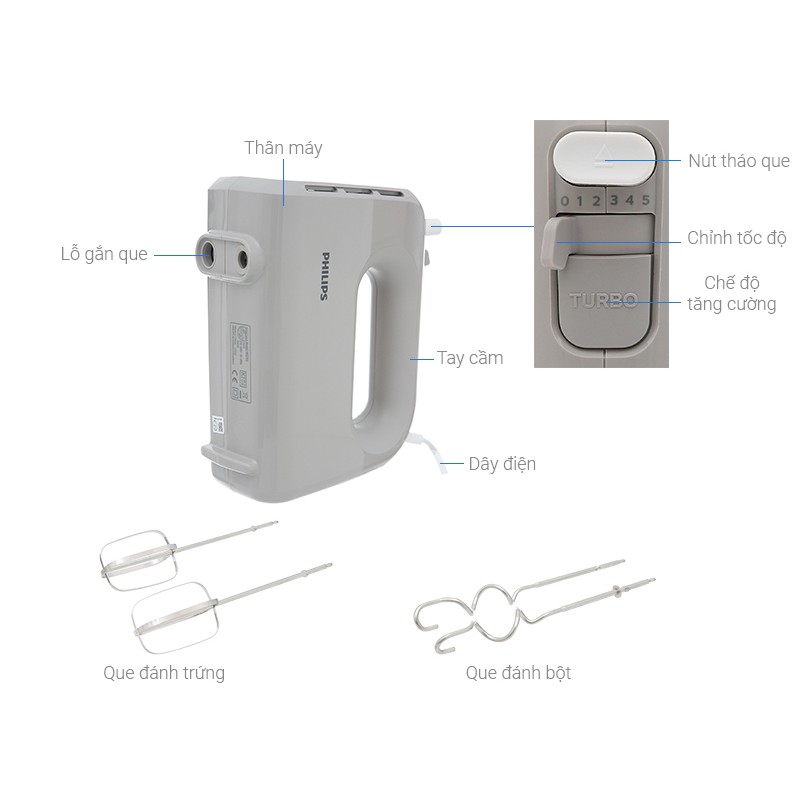 Đặc biệt, đi kèm theo đánh trứng Phillips HR3705 là 2 loại que trộn cho người dùng có thể thay đổi cho phù hợp với từng loại hỗn hợp thực phẩm khác nhau nhằm làm tăng hiệu suất trộn đều.