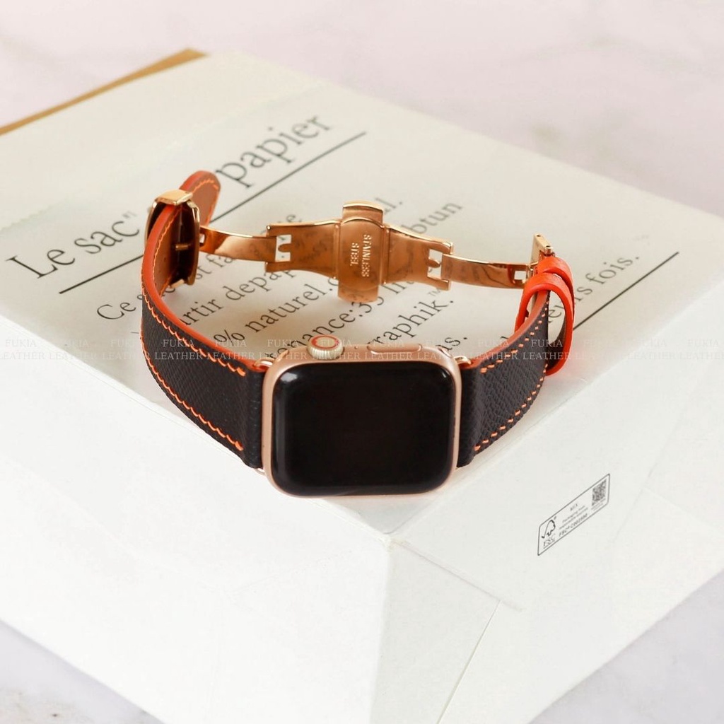 Dây da thủ công Epsom Đen Mix Cam dành cho Apple Watch, đồng hồ thông minh, đồng hồ cơ