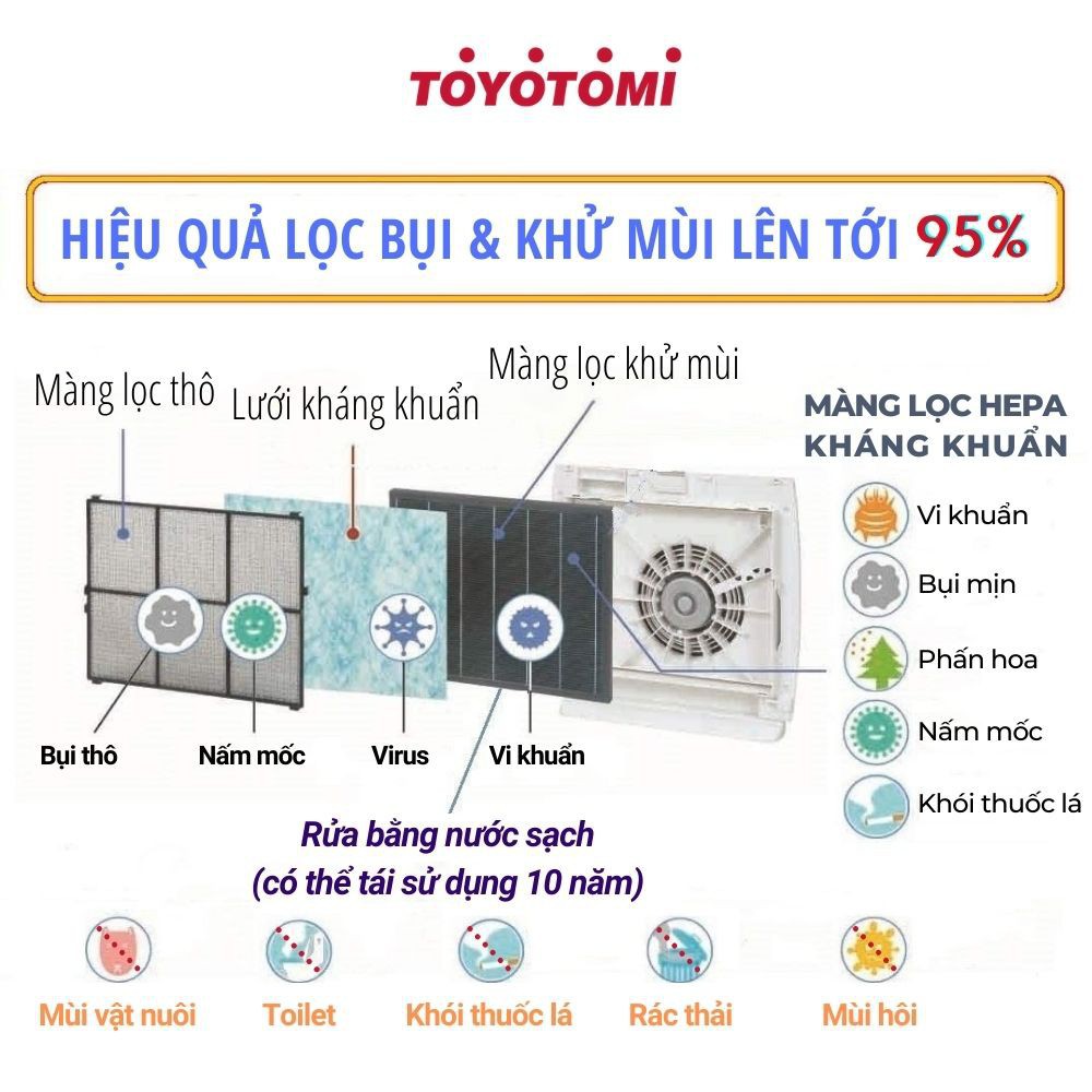 Loại bỏ 99,9% vi rút - TOYOTOMI sử dụng màng lọc 3 lớp theo tiêu chuẩn HEPA, JEM 1467 có thể lọc kháng khuẩn khử lên đến 99,9% các vi khuẩn, virus và các bụi bẩn, phấn hoa, …
