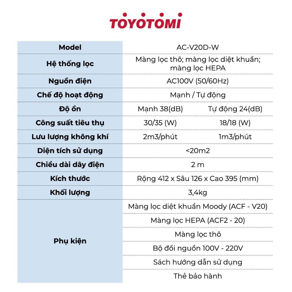 THÔNG TIN CHI TIẾT SẢN PHẨM Máy lọc không khí gia đình TOYOTOMI AC-V20D