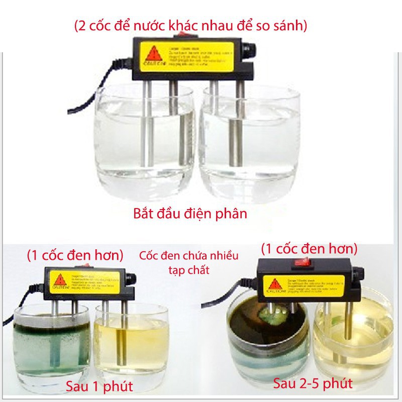 - Cho 2 cực của thiết bị điện phân vào 2 cốc nước đựng mẫu nước