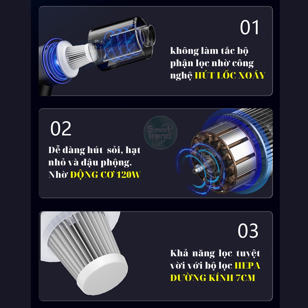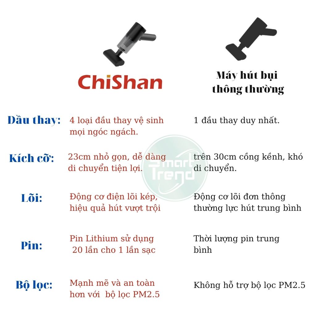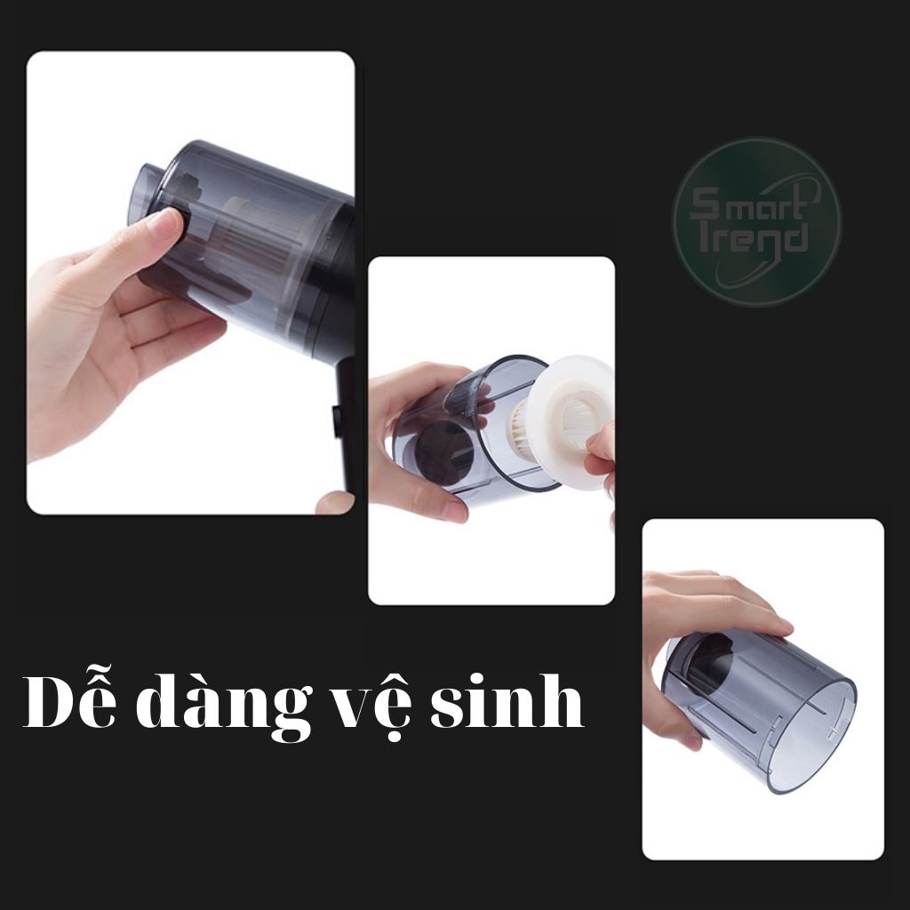 Máy hút bụi cầm tay mini không dây ShiChan hút bụi giường ô tô xe hơi 4in1 cao cấp công suất 120W.Bạn đang cần tìm một máy hút bụi cầm tay mini không dây, đa năng hút bụi được mọi địa hình. Smart trend xin giới thiệu với bạn máy hút bụi cầm tay ShiChan. Cửa sổ ô tô có các đường rãnh hẹp, dài rất khó để bạn cầm chổi quét sạch bụi bẩn. Các lỗ thông hơi, các khe, đường kẽ hoặc là lớp bụi mịn bên dưới giường nệm không dễ dàng vệ sinh. Máy hút bụi ShiChan sử dụng công nghệ hút lốc xoáy cyclone có khả năng hút sạch tối đa bụi bẩn mà không xảy ra tình trạng tắt nghẽn ống hút bởi lực li tâm đẩy các bụi bẩn ra xa trục chính giúp trục chính hoạt động tốt hơn. ChiShan mẫu hút bụi dành cho ô tô sở hữu kiểu dáng vô cùng nhỏ gọn đi cùng vỏ màu xanh dương thêm phần nhã nhặn. Với chiếc máy hút bụi mini sẽ là món gia dụng tiện ích giúp bạn làm sạch mọi ngóc ngách trên ô tô của bạn và tô điểm cho không gian. Đồng thời, với kích thước nhỏ gọn, thiết kế tay cầm hiện đại, cho phép người dùng thao tác dễ dàng và thuận tiện khi cất giữ.