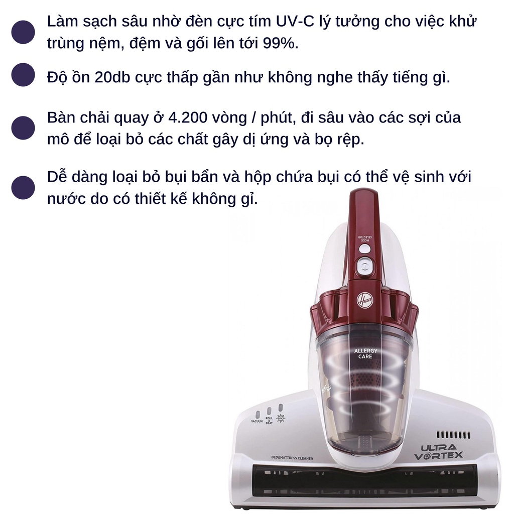 Máy hút bụi diệt khuẩn Công nghệ mới HOOVER ULTRA VORTEX MBC500UV với tác dụng làm sạch gấp ba lần giúp loại bỏ bụi bẩn, vi khuẩn có hại trong chăn, gối, thảm, nệm, ghế ô tô... và những nơi mà máy hút bụi thường không thể làm sạch.