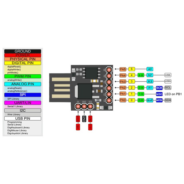 + 6 I/O Pins (2 chân sử dụng cho giao tiếp USB chỉ khi nạp chương trình, nếu không 2 chân này vẫn sử dụng bình thường)