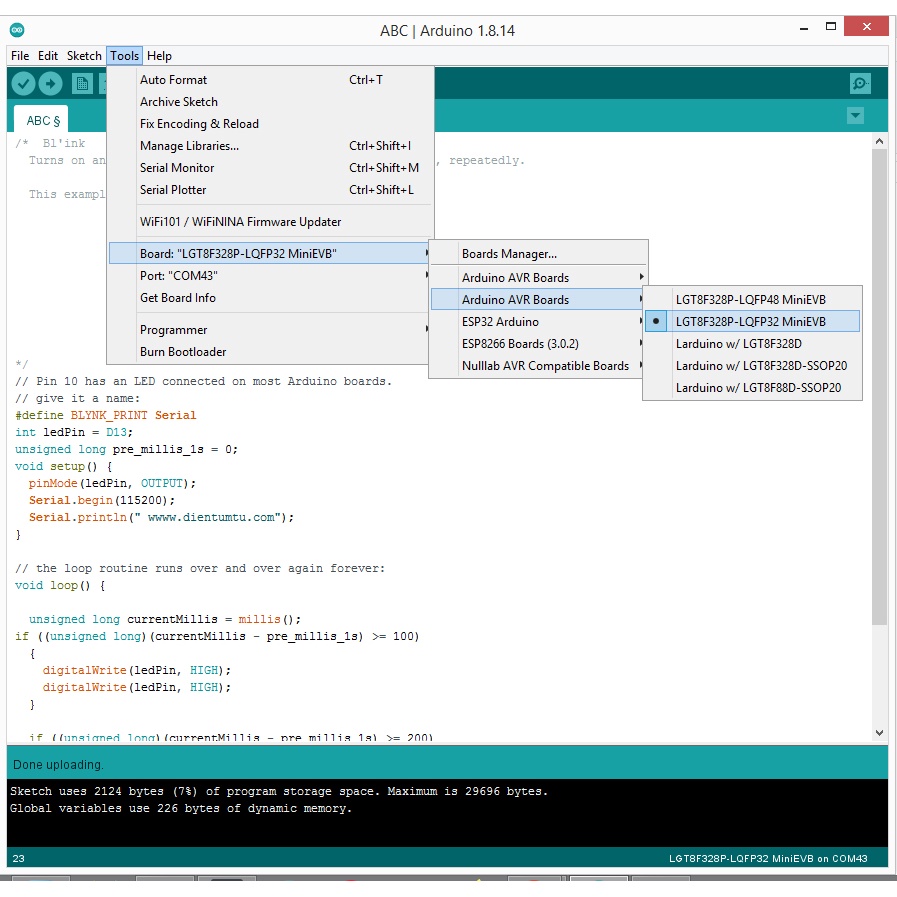 + Cài đặt, chọn board LGT8F328P như hình.