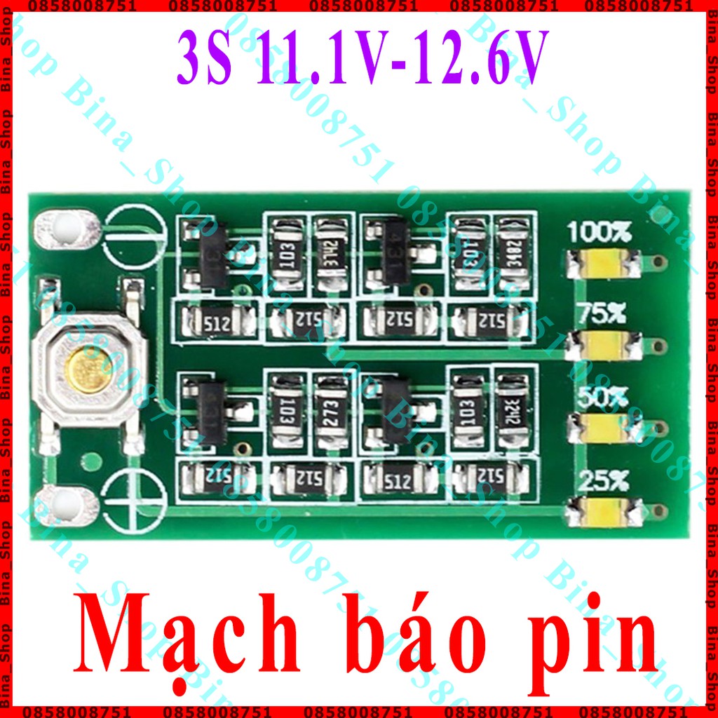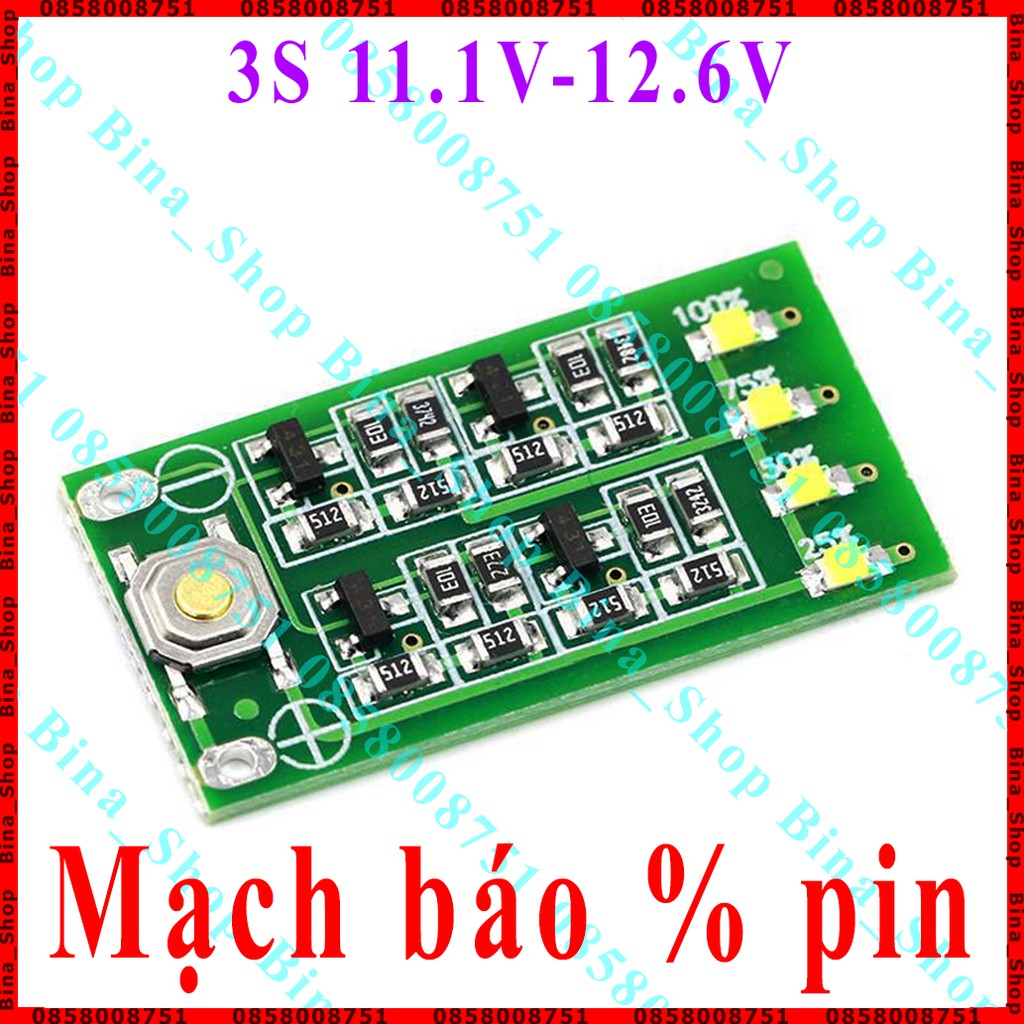 Mạch báo pin 3S 11.1V-12.6V đèn báo mức dung lượngMạch chỉ dùng cho pin có điện áp định danh 11.1V đầy 12.6V (phù hợp Li-ion 18650, lipo, ăc quy ...)