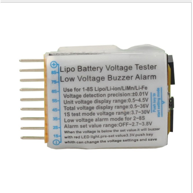 hiết bị kiểm tra mức độ sụt áp của pin Lipo theo giá trị đặt trước của người dùng, thiết bị có khả năng kiểm tra các cell của Pin Lipo Cảnh báo điện áp thấp bằng cách phát ra loa và nháy led, tự động bảo vệ chống cắm ngược nguồn, kiểm tra tình trạng làm việc của pin Lipo Bảo vệ pin từ việc sạc và xả quá mức.