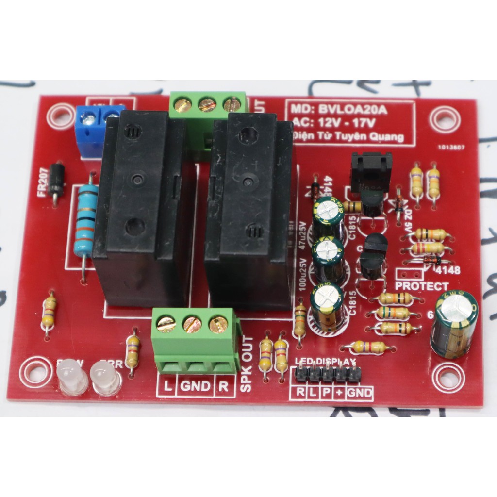 Mạch Bảo Vệ Loa Đa Năng 20A 2 Kênh Tiếng Hỗ Trợ Tới Main 48 SòMạch bảo vệ loa với dải điện áp rộng từ 12Vac đến 17Vac, Mạch được làm trên phíp sợi thủy tinh FR4 chống cháy siêu bền, 2 rơ le động lực điều hòa 20A / chiếc sở hữu sức mạnh cao nhất hiện nay trên thị trường với giá cực mềm.