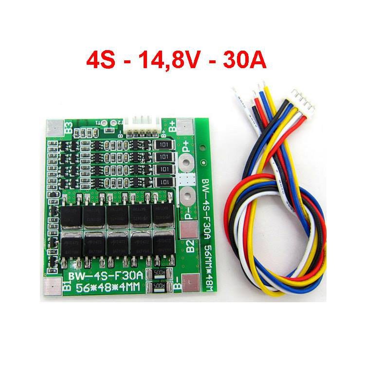 Mạch Sạc Và Bảo Vệ Pin 14.8V 4S 30A sạc cân bằng và bảo vệ cell Li-ion,có mức điện thế từ 14.4V – 16.8VMạch bảo vệ pin 4 cell nối tiếp 4S 30A Dùng cho bộ pin li-ion 18650 Dòng xả 30A, xả đỉnh 70A
