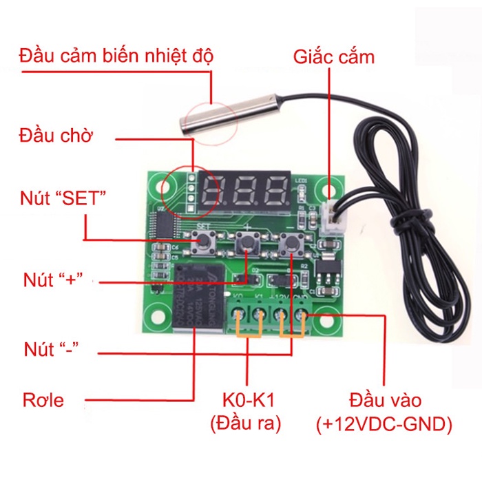 Khi nhiệt độ môi trường >=33độ, relay sẽ ở trạng thái đóng, đèn sáng ( Tiếp điểm đóng). Nhiệt độ môi trường giảm < nhiệt độ cài đặt 2 độ --> Relay ngắt, đèn báo tắt, tiếp điểm bị ngắt.