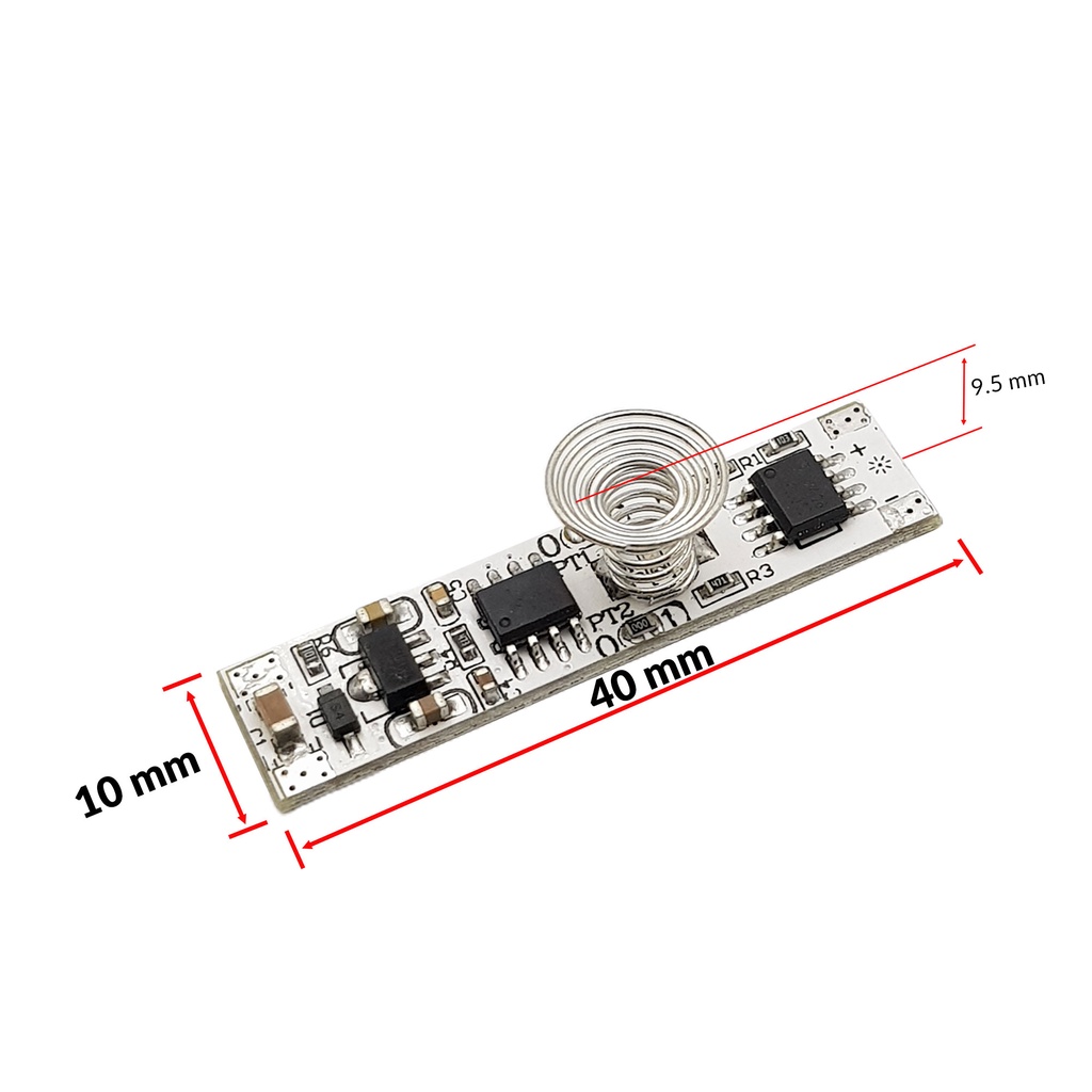 Mạch cảm ứng điện dung tích hợp dimmer LED 9-24VDC - 98S5Mạch cảm ứng điện dung tích hợp dimmer LED 9-24VDC cho điện áp đầu ra bằng điện áp đầu vào, vì vậy cần chọn đúng loại điện áp tương ứng với loại led. Module này giống như 1 công tắc cảm ứng điện dung, đóng mở led trực tiếp mà không cần qua relay (dòng tối đa 3A).