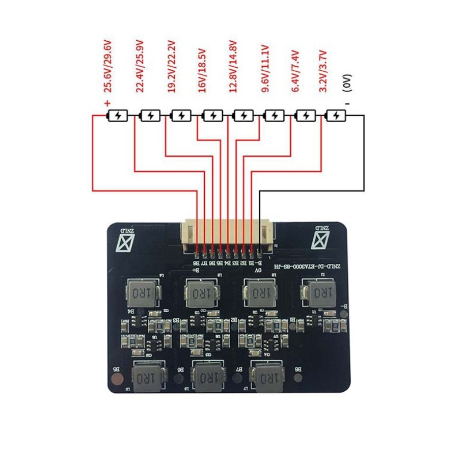 Mô-đun này là cân bằng chênh lệch điện áp liền kề, chênh lệch điện áp pin liền kề đạt hơn 0,1V và chip kích hoạt công việc cân bằng, cho đến khi chênh lệch điện áp pin liền kề nhỏ hơn 0,03V và chênh lệch điện áp liền kề tồn tại khi sạc và xả pin. Khi cân bằng được kích hoạt, lỗi điện áp pin cũng sẽ được kéo về giá trị lý tưởng hơn, giảm chi phí bảo trì pin.