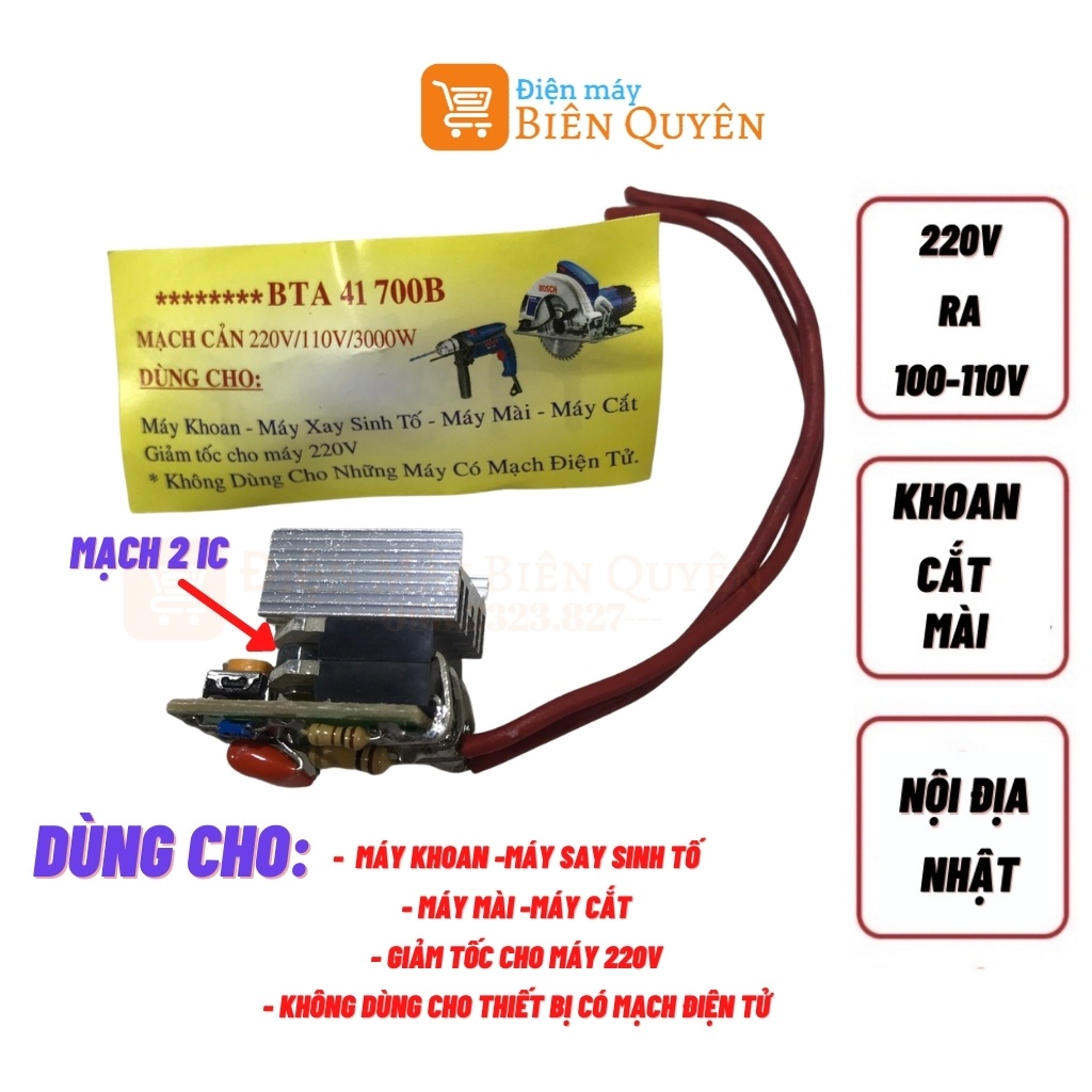 - Mạch cản đơn 3000W đổi nguồn 220V ra 110V 100V chỉ dùng cho tải sợi đốt, áp dụng công nghệ điện tử sử dụng Triac BTA41 700B với kích thước siêu nhỏ có thể gắn trực tiếp vào trong thiết bị, ứng dụng cho các thiết bị nội địa có tải là dây mai so (Mayso) sử dụng điện 100V - 110V và giảm công suất tiêu thụ cho các thiết bị điện 220V.