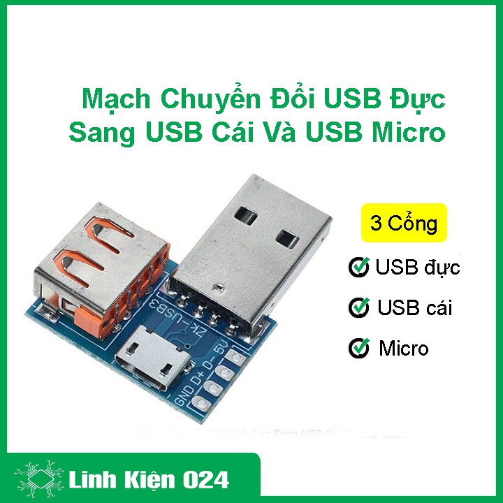 Mạch Chuyển Đổi USB Đực Sang USB Cái Và USB MicroMạch Chuyển Đổi USB Đực Sang USB Cái Và USB Micro là sản phẩm mạch chuyển đổi tín hiệu các cổng giao tiếp di động thông dụng nhất hiện nay. Chuyển đổi từ USB Đực sang cổng USB Cái, Micro. Rất tiện lợi và nhanh chóng. Ngoài ra, nó còn thích hợp sử dụng để sạc cho các thiết bị di động. Được thiết kế đơn giản dễ dàng sử dụng.