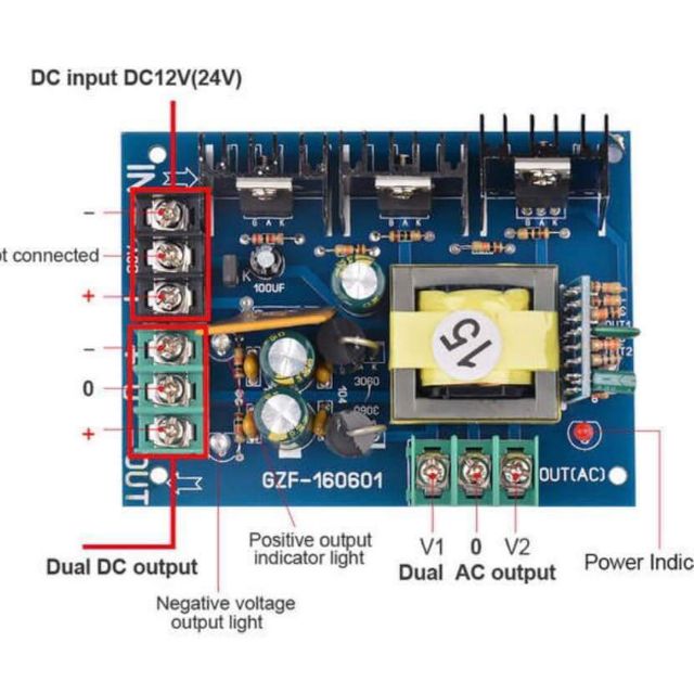 Điện cấp cho mạch là nguồn ắc quy 12 hoặc 24v DC mạch có nguồn ra đối xứng +15v 0 - 15 v có tích hợp ngõ ra AC đối xứng , mạch dùng lắp ráp thay thế cho mạch loa kéo , mạch công suất chạy nguồn đôi +-15...• SHOP CAM KẾT