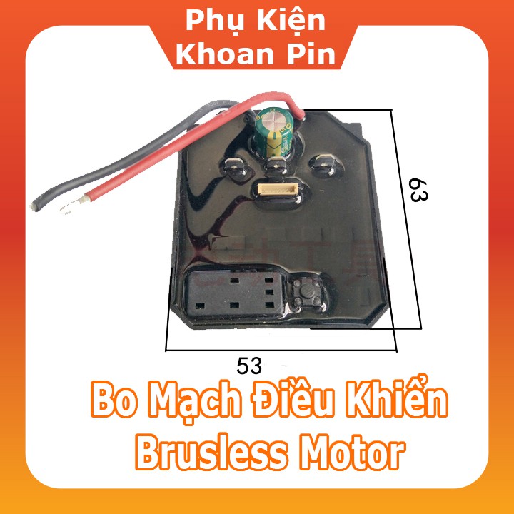 Sản phẩm sử dụng cho các máy không chổi than 18V của Trung QuốcBo mạch điều khiển dưới chân máy, có 1 phím bấm chỉnh 2 cấp nhanh chậm, đèn báo pin 3 vạch, tích hợp tính năng Stop khi đảo chiều máy. Bo mạch gồm dây nguồn vào (- màu đen, + màu đỏ), 3 tiếp điểm hàn dây lên motor, 1 giắc cắm với công tắc