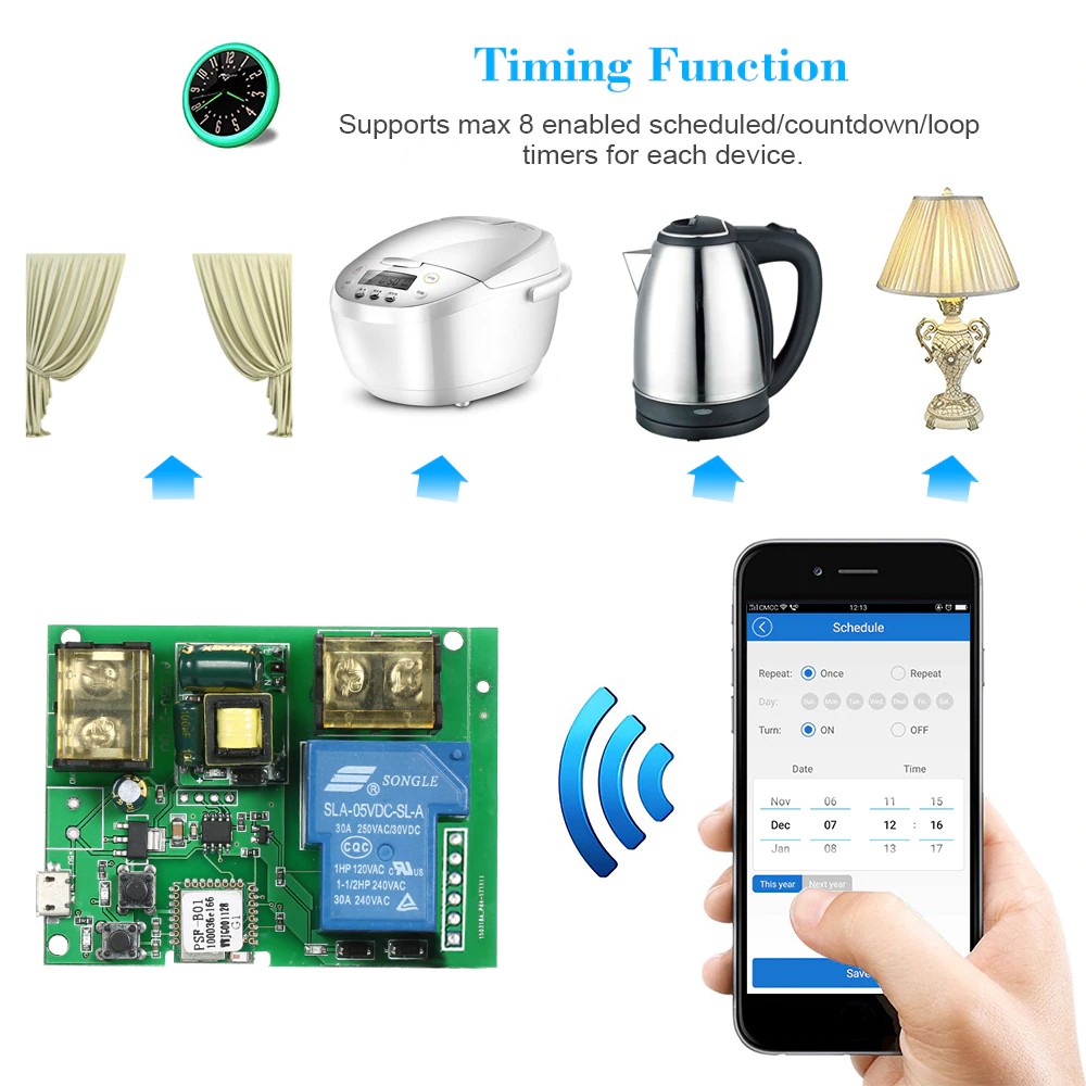 Hỗ trợ kích hoạt từ xa hoặc hủy kích hoạt thiết bị được kết nối, ví dụ như đèn, ấm đun nước điện, nồi cơm điện, rèm điện, cửa gara, v.v.