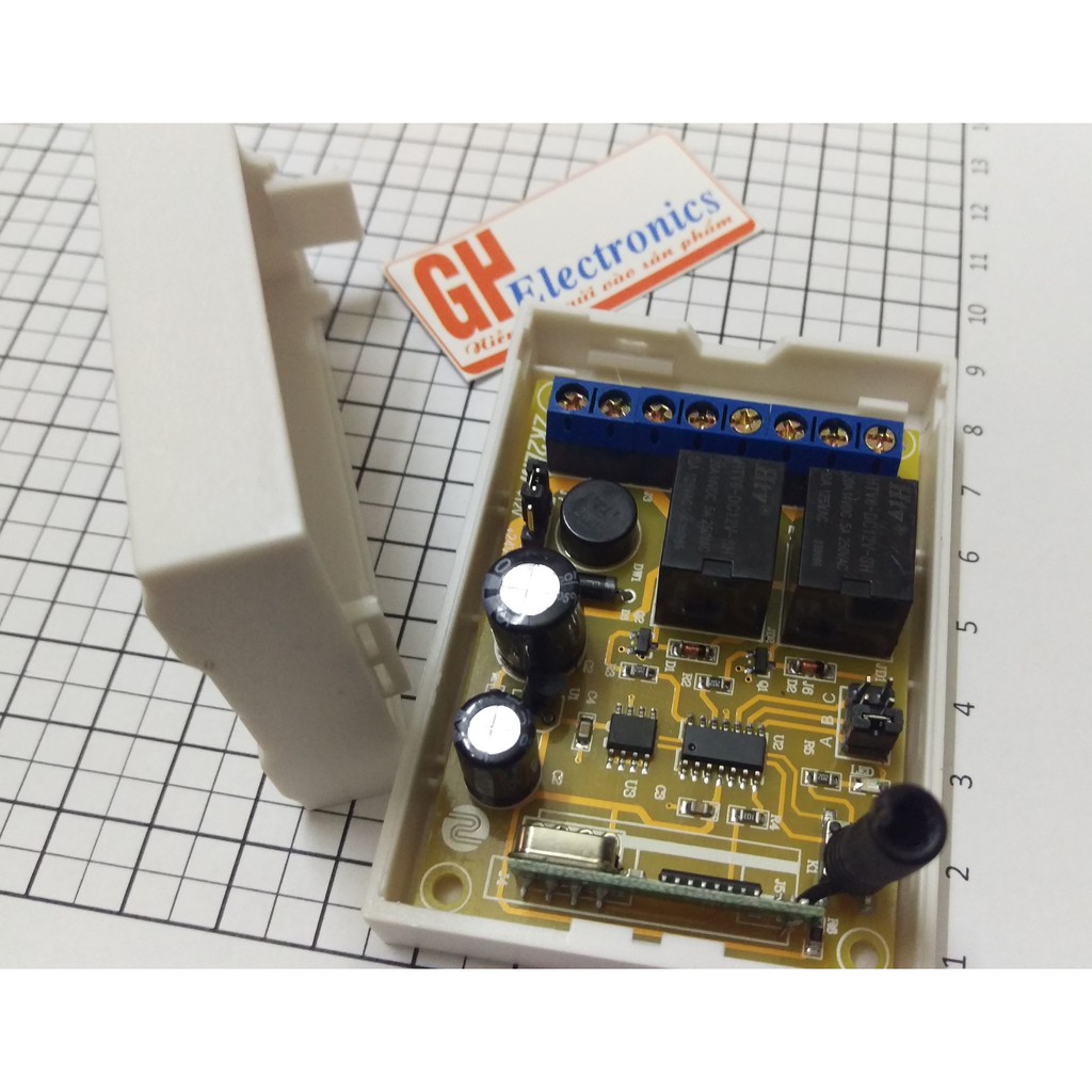 Bo mạch điều khiển từ xa 2 kênh hoạt động độc lập, 2 chức năng (chốt và không chốt).Sử dụng điện áp 12V hoặc 24V công suất đóng cắt 250W trở xuống.