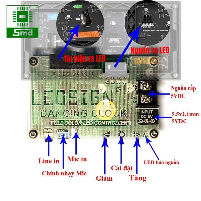LED nháy theo nhạc full color: Sản phẩm được cài sẵn rất nhiều hiệu ứng nháy theo nhạc đa dạng cả về chi tiết lẫn màu sắc. Sản phẩm có 2 đầu vào tín hiệu: Đầu vào 1 là MIC IN: Micro tích hợp sẵn đem đến sự tiện dụng, chỉ cần cấp nguồn là có thể sử dụng luôn. Đầu vào 2 là LINE IN: Jack audio 3.5mm quen thuộc cho hiệu quả nháy theo nhạc trung thực.