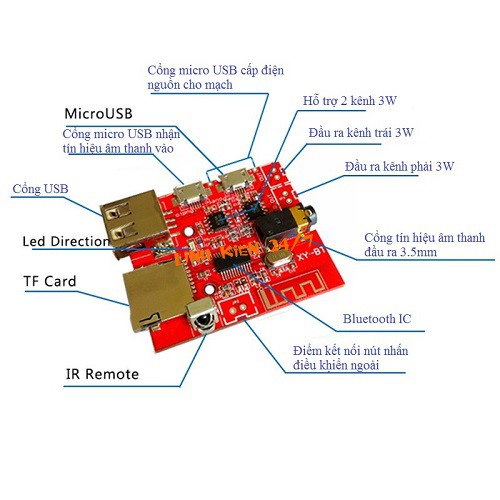 Nguồn sử dụng cáp Micro USB 5v hoặc nguồn pin 3.7-5v cần hàn vào chân nguồn đầu vào dưới jack cắm cổng Micro USB. Lưu ý khi sử dụng chế độ phát nhạc từ USB cần cung cấp nguồn 5v cho mạch.