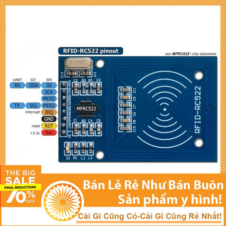 - Module RFID RC522 sử dụng IC MFRC522 của Phillip dùng để đọc và ghi dữ liệu cho thẻ NFC tần số 13.56mhz, với mức giá rẻ thiết kế nhỏ gọn, module này là sự lựa chọn hàng đầu cho các ứng dụng về ghi đọc thẻ RFID.