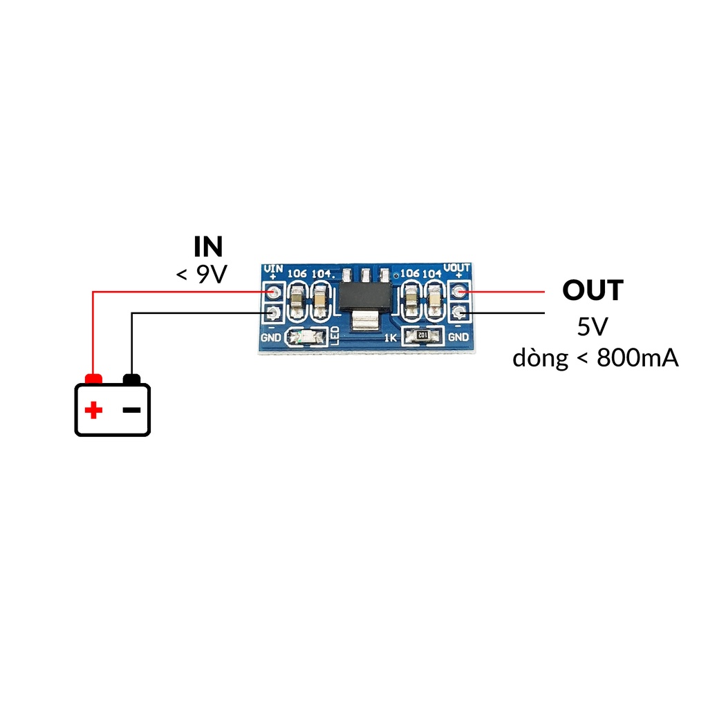 Điện áp vào : DC <9V (Điện áp vào tối thiểu phải cao hơn điện áp ra 1V).