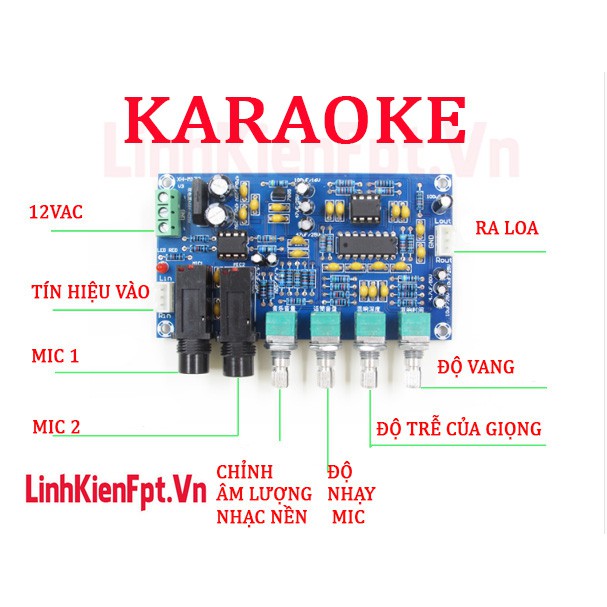 Điều chỉnh được âm lượng nhạc, âm lượng micro, echo bằng chiết áp trên mạch Mạch khuếch đại micro Karaoke