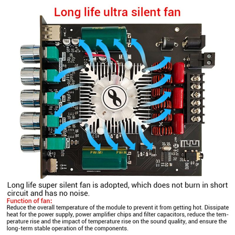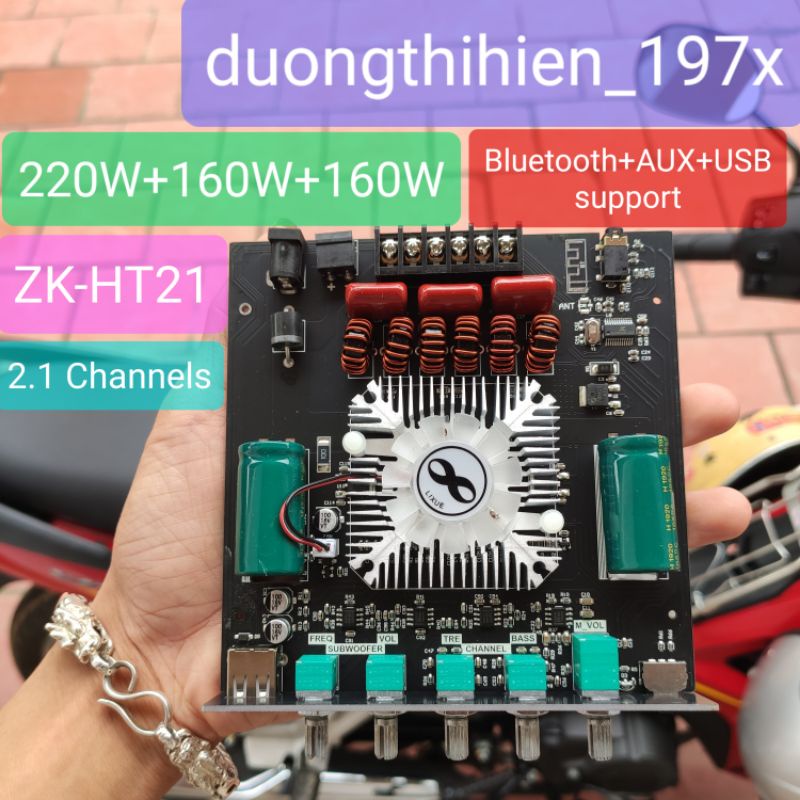 Thông số kỹ thuật:- Là mạch khuếch đại âm thanh 2.1. Có 1 ngõ ra loa sub (loa siêu trầm) công suất 220W và 2 ngõ ra loa vệ tinh công suất 160W mỗi kênh. Có nhiều cổng kết nối như AUX và USB. Tất nhiên có cả bluetooth 5.0