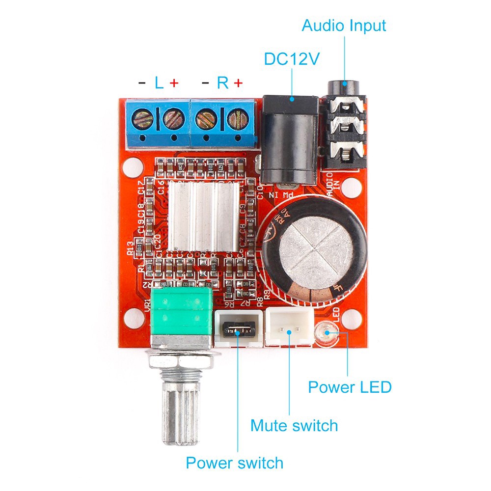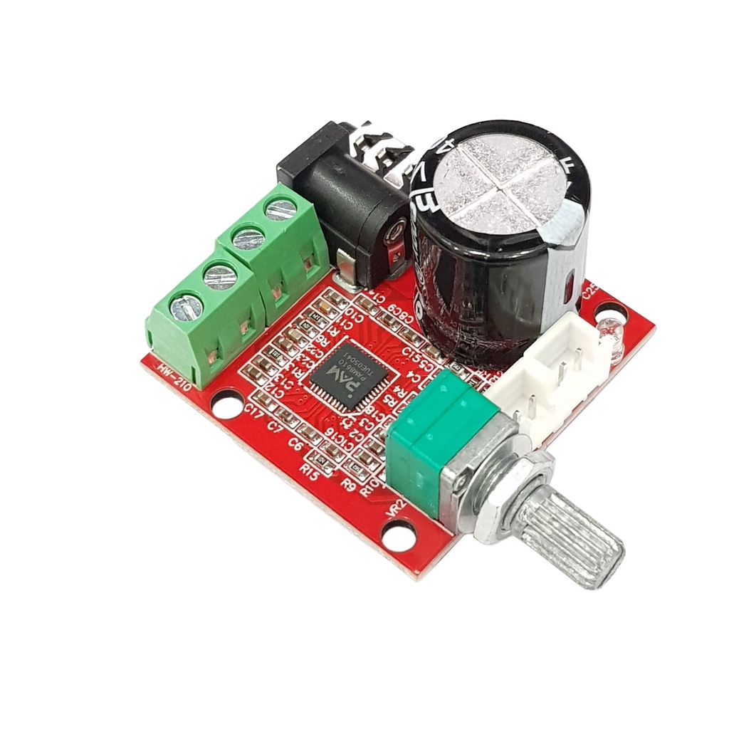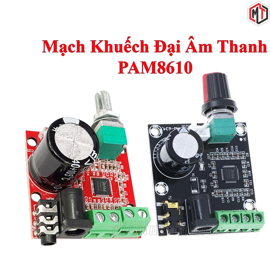Mạch khuếch đại âm thanh PAM8610 10W Hifi 2.0 Class D được thiết kế dựa trên IC PAM8610 với công suất khuếch đại 2x10W chuẩn class D, đặc điểm ưu việt của khuếch đại tín hiệu âm thanh Class D là ít tỏa nhiệt, hiệu suất ngõ ra cao và kích thước nhỏ gọn, mạch có thể điều chỉnh âm lượng ngõ ra trực tiếp trên board bằng volume, âm thanh ngõ vào qua cổng 3.5mm.Mạch khuếch đại âm thanh PAM8610 10W Hifi 2.0 Class D được thiết kế nhỏ gọn nhưng đầy đủ các chức năng bảo vệ quá dòng, quá nhiệt và chống ngắn mạch, giúp bạn thiết kế một vài mạch loa cầm tay với âm thanh trung thực sống động hoặc một máy phát nhạc cầm tay với công suất cao một cách dễ dàng.