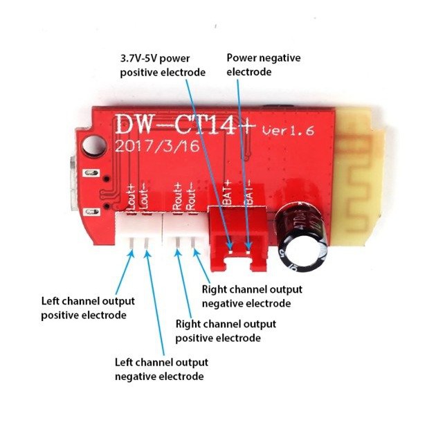 Tính năng sản phẩm:Mạch Khuếch Đại Âm Thanh Bluetooth 4.2-2x5W DW-CT14+ là mạch nhận Bluetooth âm thanh đã bao gồm module khuếch đại âm thanh 2x5W, kết hợp tốt với 2 loa 5W 4ohm.