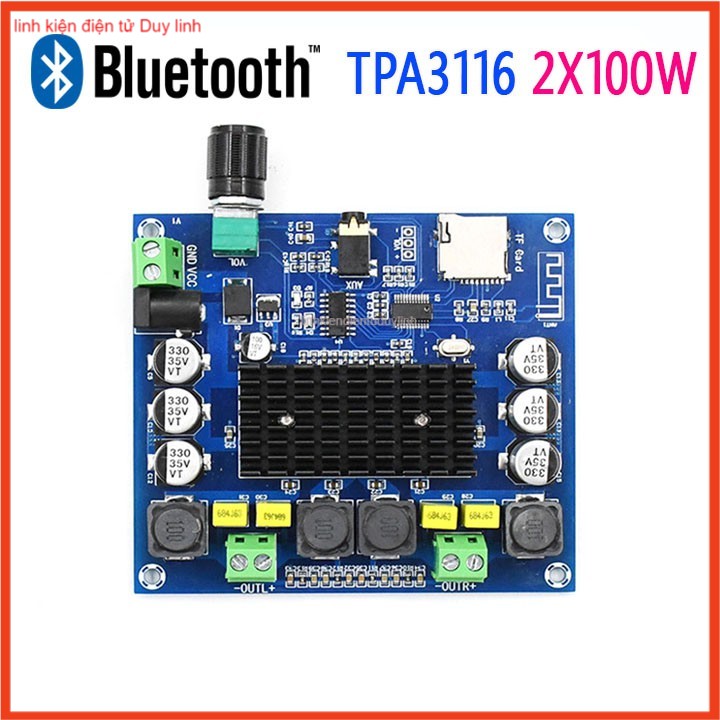 + Mạch khuếch đại bluetooth TPA 3116 sử dụng chip khuếch đại Class D TPA 3116 cho ngõ ra 2 kênh với công suất mỗi kênh 100W.